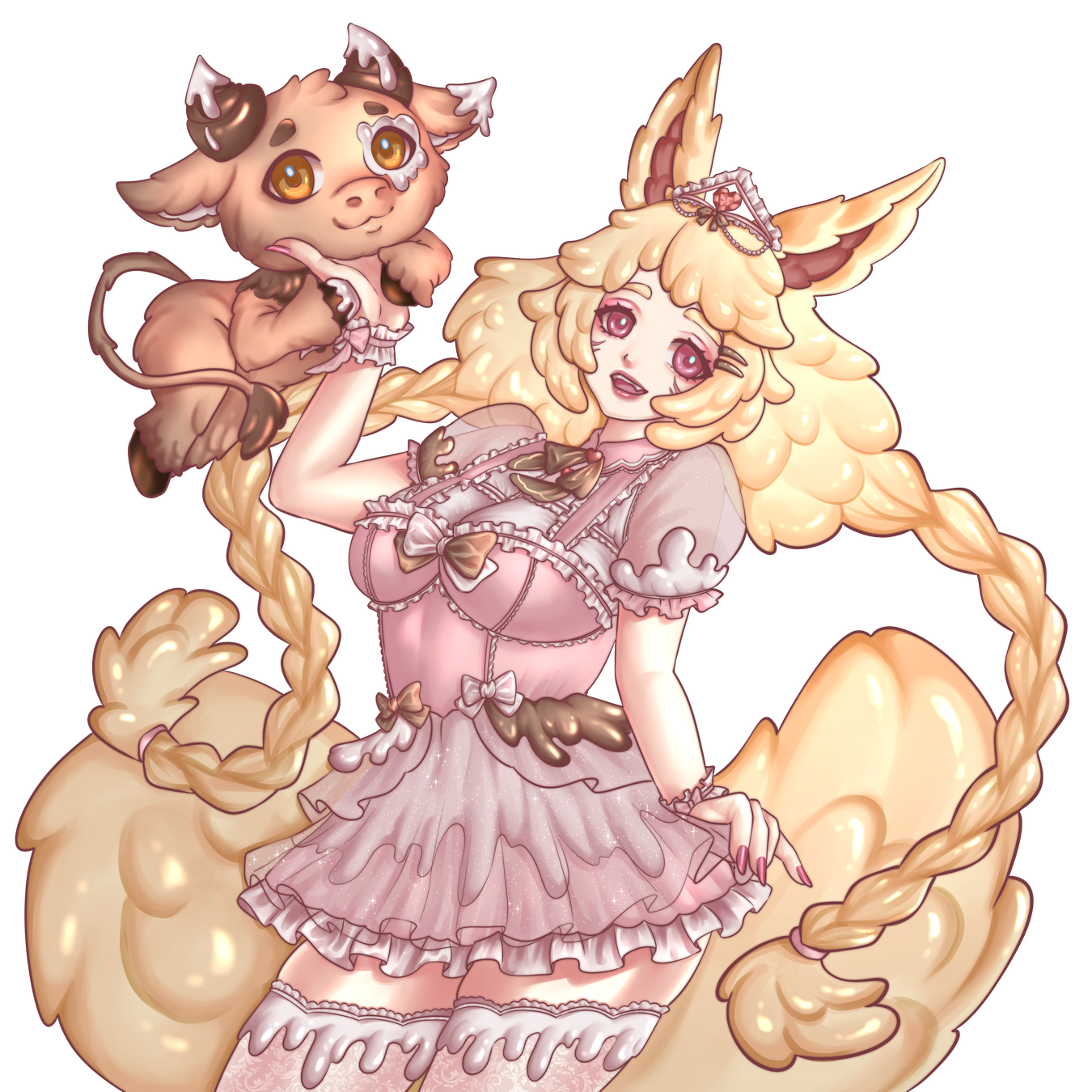 Who is Mooki?So who is "Mooki"? Mooki is my persona, my brand, my online alias. She is the embodiment of me within the digital world. She is me. However, Mooki is shorter than I am, standing at a solid 5'3!Mooki is a fennec fox made of cake batter, icing and ice cream - she's as sweet as can be. She is a sweet toothed, cutesy fashion enjoyer, just as I am! She will only wear clothes that include frills in at least 2 places! She enjoys art, streaming, and cute animals like her loyal subjects; the Gingerbread cows! And don't forget her best little companion, Dooki!